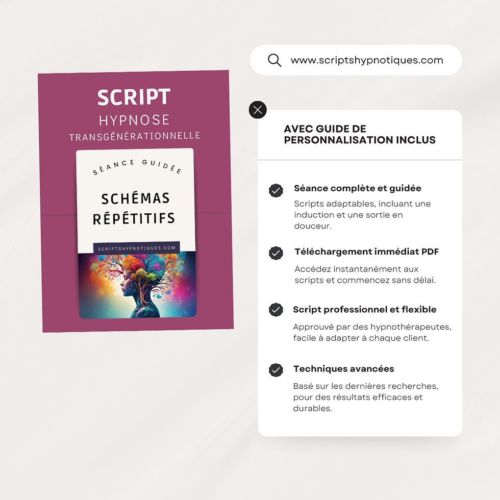 Retrouvez ici toutes les ressources conçues exclusivement pour les praticiens certifiés, souhaitant enrichir et professionnaliser leurs accompagnements. Chaque script a été élaboré par des professionnels de l’hypnose, avec rigueur, cohérence et exigence afin de garantir une expérience solide, fluide et efficace.
